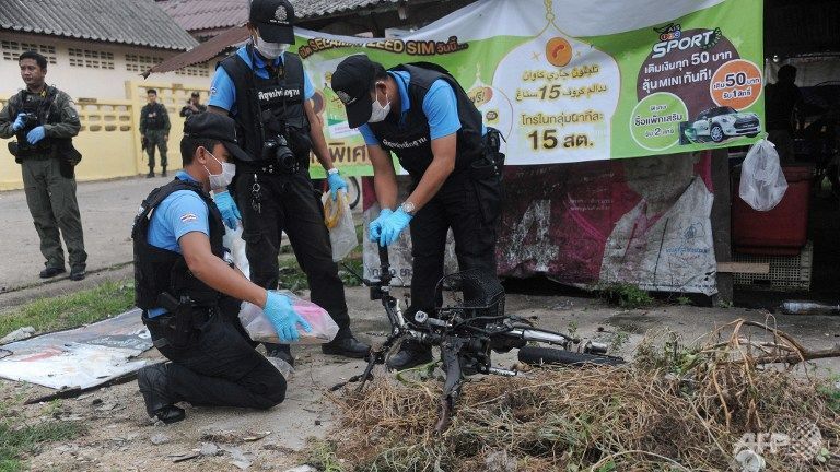 | Thai bomb squad members inspect the site of a motorcycle bomb attack the night before at a Buddhist village in the Rangae district of Thailand's restive southern province of Narathiwat on Sep 18, 2015. (Photo: AFP/Madaree TOHLALA) |