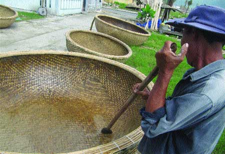 First, the craftsmen split the bamboo into different widths, but only the outer layers are used because they are waterproof. Production starts two days after the split lengths are dried in the sun. Craftsman begin by weaving the thin strips into the shape of a large basket with one or two hoops of thicker strips at the top.