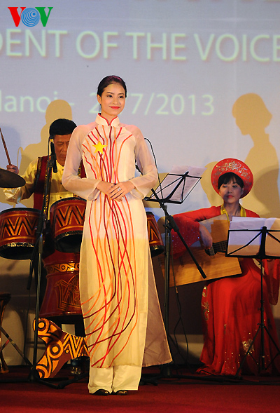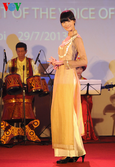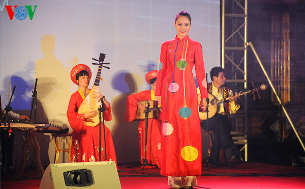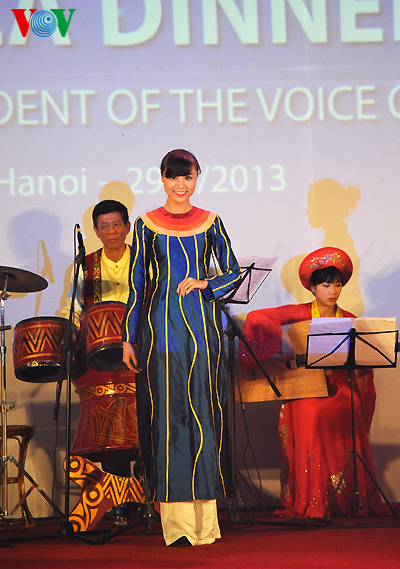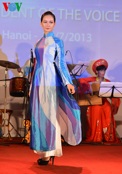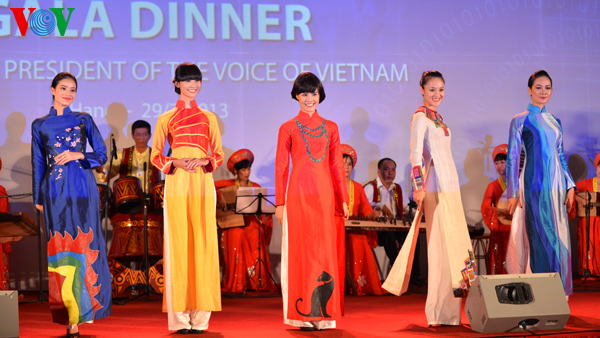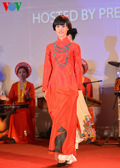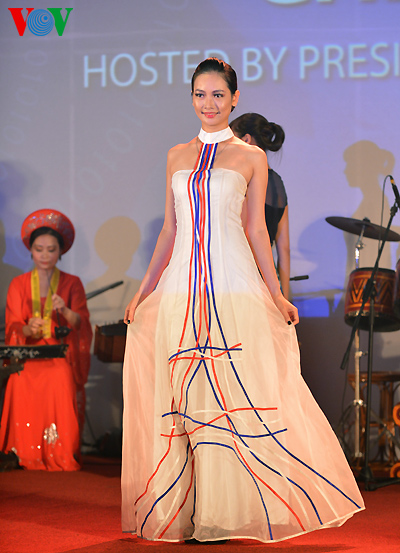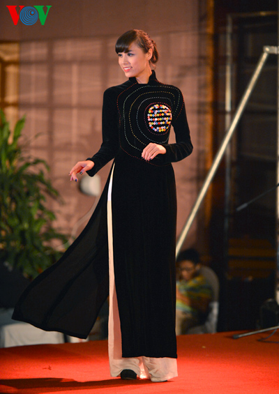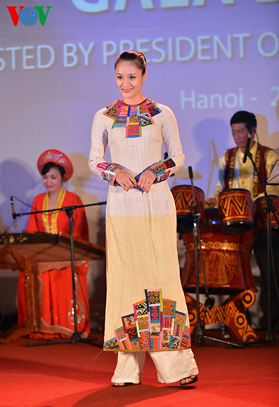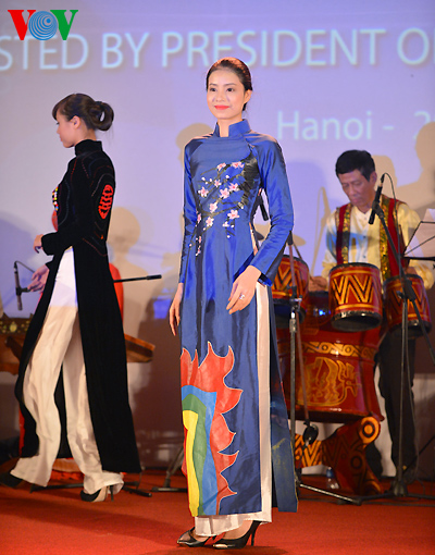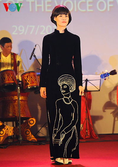 The clothes are made with traditional embroidery and lacquer painting techniques on Vietnamese silks featuring the country’s landscape, architect, culture, culinary art, flowers and women.