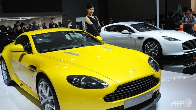File photo of a model posing next to a Aston Martin V8 Vantage at the Shanghai auto show in China. (AFP/Peter Parks)