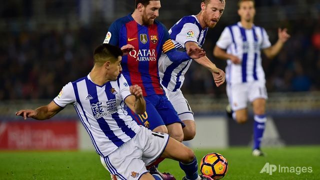 | FC Barcelona's Lionel Messi (C) duels for the ball with Real Sociedad's Yuri Berbiche and David Zuturuza (R) during the Spanish La Liga soccer match between FC Barcelona and Real Sociedad, at Anoeta stadium in San Sebastian, northern Spain on Nov 27, 2016. (Photo: AP/Alvaro Barrientos) |