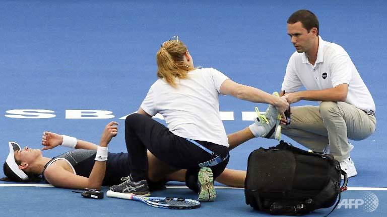 | Garbine Muguruza of Spain (left) lies on the court in pain as she receives medical treatment before retiring from her second round match against Aleksandra Krunic of Serbia at the Brisbane International tennis tournament. (Franca TIGANI/AFP) |