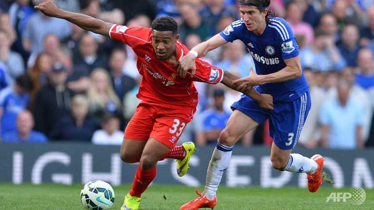 | Chelsea's Filipe Luis (R) challenges Liverpool's Jordon Ibe (L) during the English Premier League football match at Stamford Bridge in London. (AFP/GLYN KIRK) |