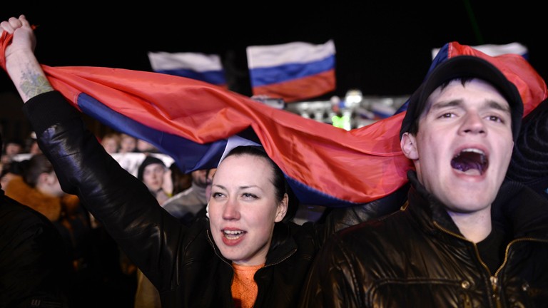People sing the Russian national anthem as they celebrate in Simferopol's Lenin Square on March 16, 2014 after exit polls showed that about 95.5 percent of voters in Ukraine's Crimea region supported union with Russia. (AFP/DIMITAR DILKOFF)