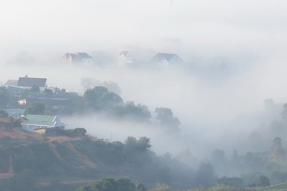 | Fog covers the hills and houses early in the morning at Trai Mat |