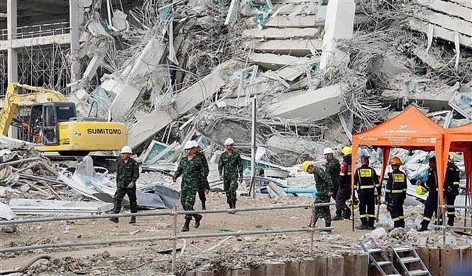 | Rescuers carry out their duties at a collapsed building in Bangkok, Thailand, following the earthquake in Myanmar on March 28. (Photo: Kyodo/VNA) |