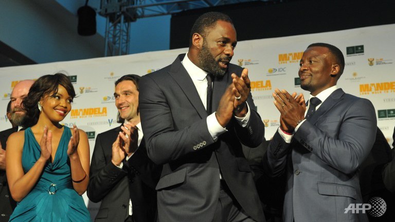 British actor Idris Elba (C), who plays the role of Nelson Mandela in the movie "Mandela, Long Walk to Freedom", applauds on the day of the movie's premiere in Johannesburg. (AFP/ALEXANDER JOE)