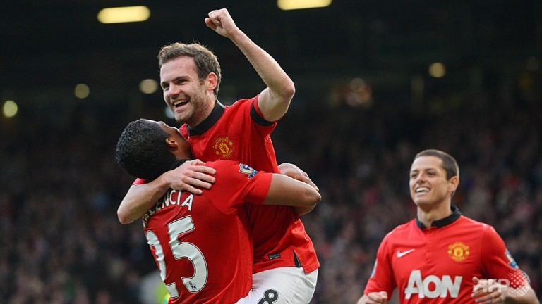 Manchester United's Juan Mata (2nd L) celebrates after scoring his team's fourth goal against Norwich City at Old Trafford. Ryan Giggs' first match as Manchester United's interim manager ended in a 4-0 Premier League thrashing of Norwich City.