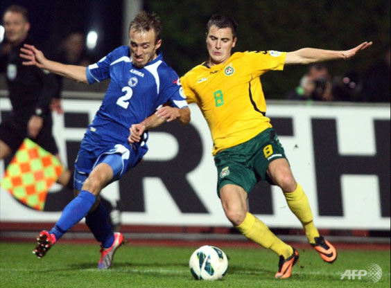 Bosnia-Herzegovina's Avdija Vrsajevic L) vies for the ball with Lithuania's Egidijus Vaitkunas during the FIFA 2014 World Cup group G qualifying football match Lithuania vs Bosnia-Herzegovina in Kaunas, Lithuania. (AFP/Petras Malukas)