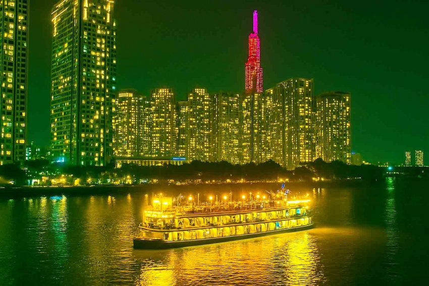 | Cruise ships and floating restaurants light up the Saigon River with vibrant colours |