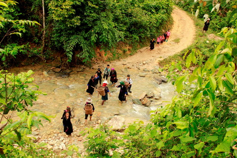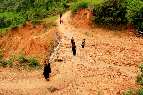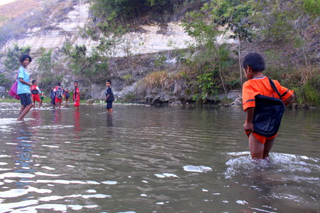 Vietnam: Every day, Linh and her friends wake up at 4:30 in the morning to walk to school. It is a three-km journey from her house to school. She has to pass over several streams and steep slopes. In the flood season, the stream current is very dangerous. Photo: Truong Cong Thanh