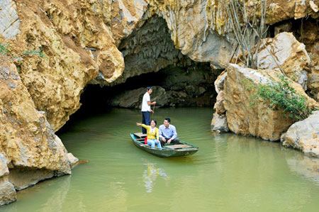 | Natural wonder: Tourists ride boats to visit Buddha Cave where there is a big Buddha-shaped stalactite sitting beside an underground river. |