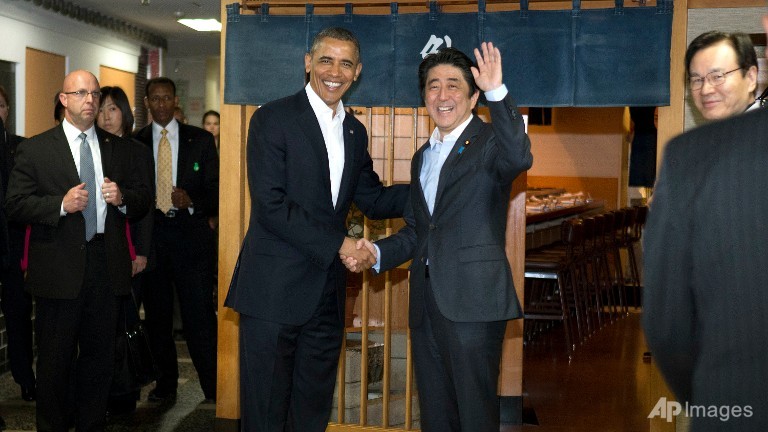 US President Barack Obama and Japanese Prime Minister Shinzo Abe shake hands before having dinner at the Sukiyabashi Jiro sushi restaurant in Tokyo. Obama begins a four-country trip through the Asia-Pacific region. (AP/Carolyn Kaster)