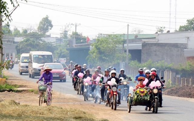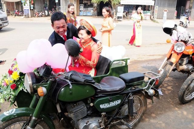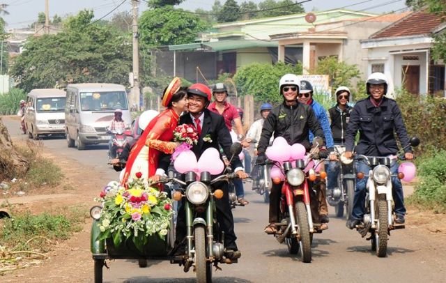 ![]() Phan Thanh Tam is pictured driving his bride, Vu Thi Ut Thin (both leading the convoy) during their bride-fetching ritual held in Krong Pak District in the Central Highlands province of Dak Lak on April 5, 2015 in a motorcade of nearly 40 Minsk bikes. Photo: Tuoi Tre |
