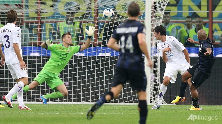 Inter Milan's Cicero Jonathan (R) scores a goal during their Serie A soccer match against Fiorentina at the San Siro stadium in Milan, Italy. (AP/Antonio Calanni source channelnewsasia.com)