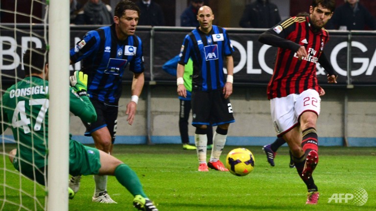 AC Milan's Brazilian forward Kaka kicks and score during the Serie A football match between AC Milan and Atalanta at San Siro Stadium in Milan. (AFP/GIUSEPPE CACACE)