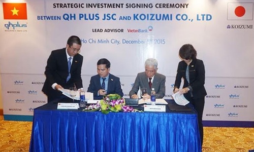 | Leaders of QH Plus and Koizumi signs the strategic investment agreement. According to the investment agreement, Koizumi will buy 23 per cent of QH Plus's shares.-Photo enternews.vn |