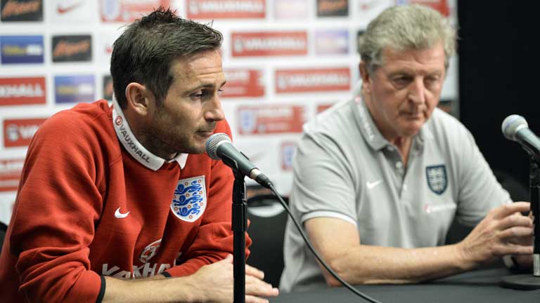 England midfielder Frank Lampard (L) and England coach Roy Hodgson answer questions during a joint press conference after their team's training session at Miami Sun Life Stadium in Miami Gardens, Florida.