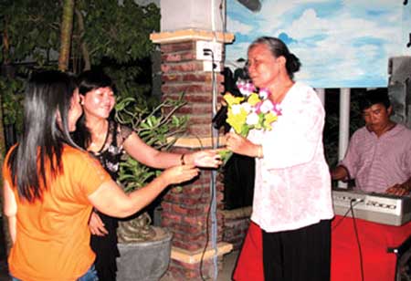 | Can't beat experience: An elderly singer in Hoa Vinh Village receives flowers and applause from listeners. — Photos www.baophuyen.com.vn |