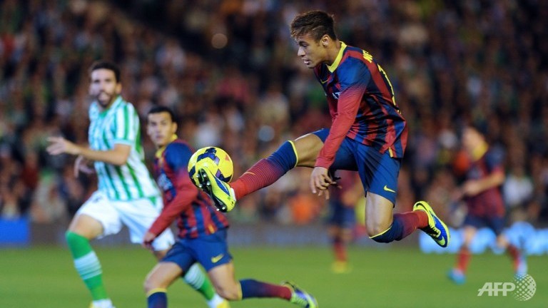 Barcelona's Brazilian forward Neymar da Silva Santos Junios controls the ball in mid-air during the Spanish league football match against Real Betis. (AFP PHOTO/JORGE GUERRERO)