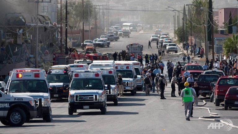Ambulances arrive at the scene as smoke billows from a candy factory in Ciudad Juarez, in northern Mexico, after a boiler exploded. The explosion at the Blueberry factory caused the ceiling to collapse, injuring more than 40 people and leaving 20 more missing, officials said. (AFP/JESUS ALCAZAR)