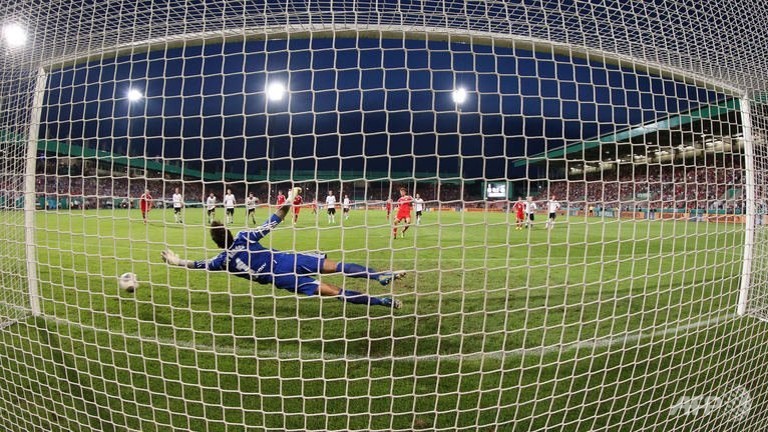 Bayern's Thomas Mueller (back) scores past Rehden's goalkeeper Milos Mandic in Osnabrueck. (AFP/Friso Gentsch)