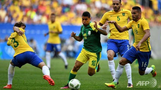 | South Africa player Keagan Dolly (C) dribbles past Brazil players Rodrigo Caio (L), Renato Augusto (2nd R) and Thiago Maia, during the Rio 2016 Olympic Games first round Group A men's football match at the Mane Garrincha Stadium in Brasilia. (EVARISTO SA/AFP) |