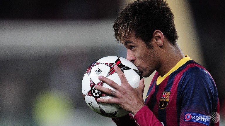 Barcelona's Brazilian forward Neymar da Silva Santos Junior kisses a ball after scoring a hat-trick during the UEFA Champions League Group H football match FC Barcelona vs Celtic FC at the Camp Nou stadium in Barcelona. (AFP/JOSEP LAGO)