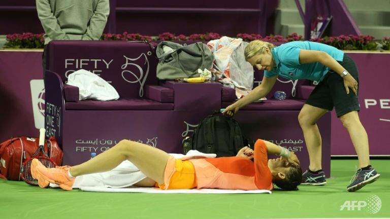 | Andrea Petkovic of Germany is treated as she plays against Jelena Ostapenko of Latvia during their Qatar Open semi-finals tennis match on Feb 26, 2016 in the Qatari capital Doha (Photo: AFP/Karim Jaafar) |