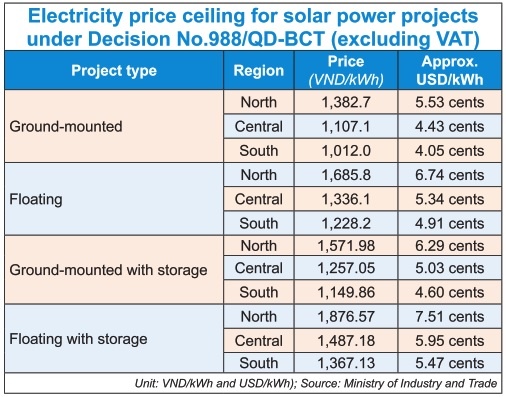 The framework sets out maximum electricity purchase prices (excluding VAT) based on three regional zones – north, central, and south – and categorises different types of solar power projects, including ground-mounted, floating, and those integrated with battery energy storage systems.