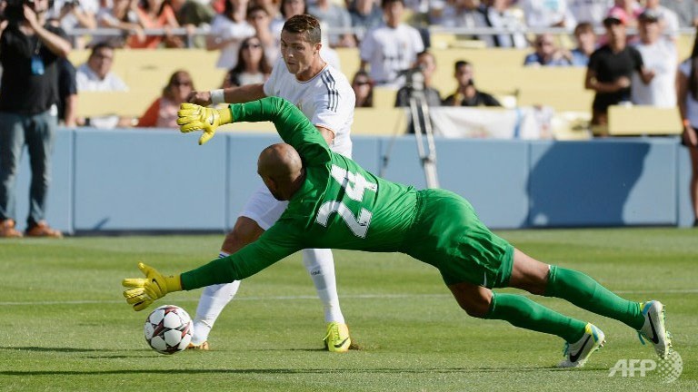 Real Madrid's Cristiano Ronaldo scores a goal against goalkeeper Tim Howard during the first half of the 2013 Guinness International Champions Cup at Dodger Stadium. (Kevork Djansezian/Getty Images/AFP)