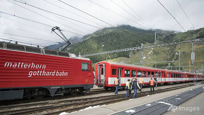 | Officials investigate a train at a station in Andermatt, Switzerland, after a train locomotive crashed into its own passenger cars. (Photo source: Urs Flueeler/Keystone via AP) |