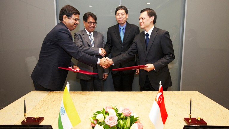 India's Minister of Civil Aviation, Shri Ajit Singh (2nd-L), and Singapore's Transport Minister Lui Tuck Yew (2nd-R) witnessing the signing of the enhanced Air Services Agreement between Singapore and India on 2 April 2013. (Photo: Singapore's Transport Ministry and Trade and Industry Ministry)