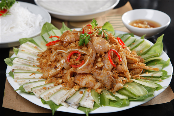It is also a particularly attractive Hanoi dish as the noodles, chicken, eggs, pork slices, and a dollop of shrimp paste are carefully arranged to resemble a flower.