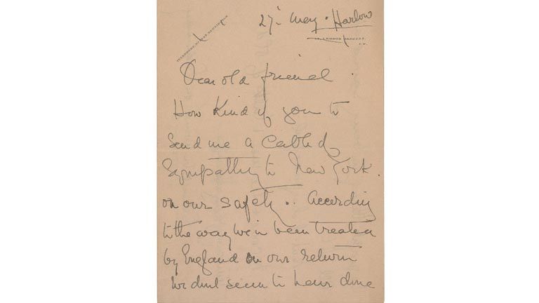 "How kind of you to send me a cable of sympathy from New York on our safety," the fashion designer wrote to a stateside friend. "According to the way we've been treated by England on our return we didn't seem to have done the right thing in being saved at all!!!! Isn't it disgraceful."