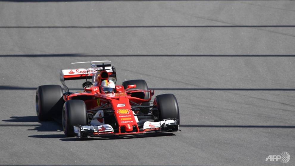 | Ferrari's German driver Sebastian Vettel steers his car during the qualifying session for the Formula One Russian Grand Prix at the Sochi Autodrom circuit in Sochi on Apr 29, 2017. (Photo: AFP/Alexander Nemenov) Read more at http://www.channelnewsasia.com/news/sport/motor-racing-vettel-on-pole-for-russian-gp-in-ferrari-one-two-8806188 |
