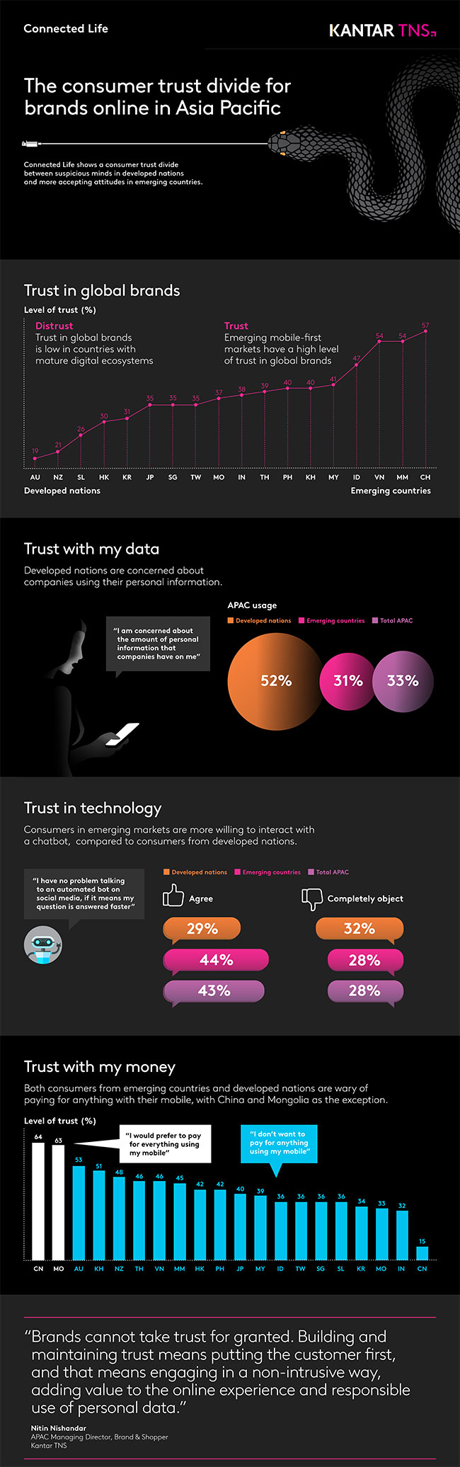 “Trust is fragile. Brands in emerging countries see higher levels of consumer trust today than those in developed ones, but they should not take it for granted. To build and protect trust, brands need to put the customer first. This means understanding their motivations, understanding the right moments to engage with them, recognising that their time is valuable, and being more transparent about how and when they collect and use their personal data. Above all, it means putting the customer first—something that many marketers have forgotten to do,” said Michael Nicholas, global lead of Connected Solutions, Kantar TNS.