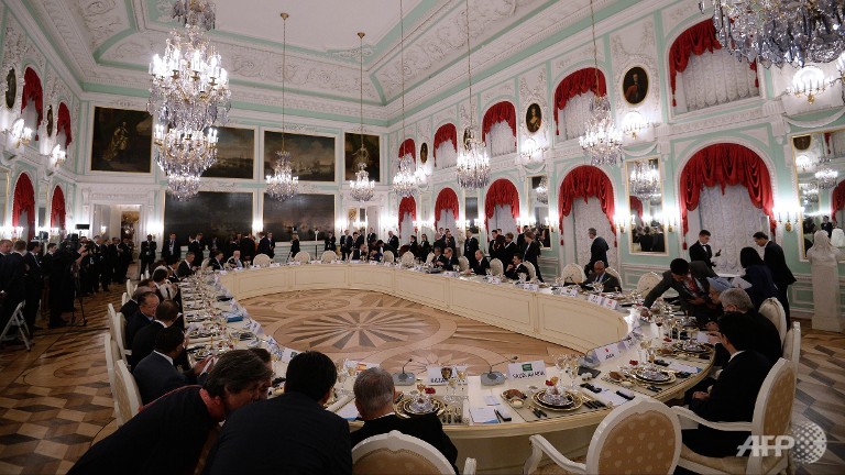 General view of the dinner table of the G20 summit at Peterhof Palace in Saint Petersburg. (AFP PHOTO/G20 RUSSIA)